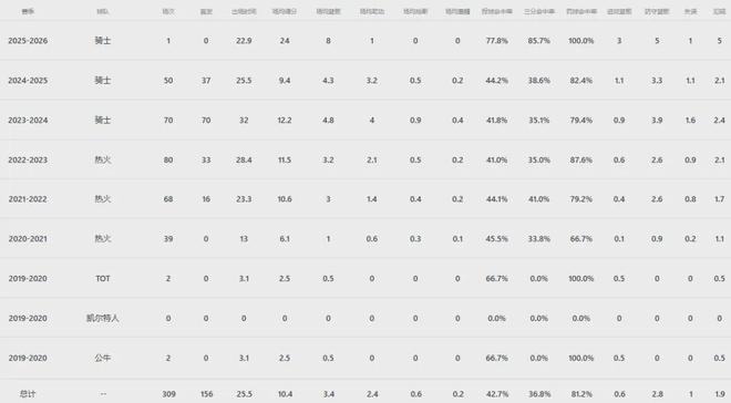 这哥们出生于1996年3月28日,19届落选秀,身高1米96&臂展2米01的锋卫摇摆人,NBA生涯至今常规赛场均出战25.5分钟贡献10.4分3.4板2.4助,场均以37%命中率扔进2.3记三分球;季后赛场均出战29.1分钟得到9.8分4.2板2.2助,场均以33.9%命中率扔进2.2记三分球。