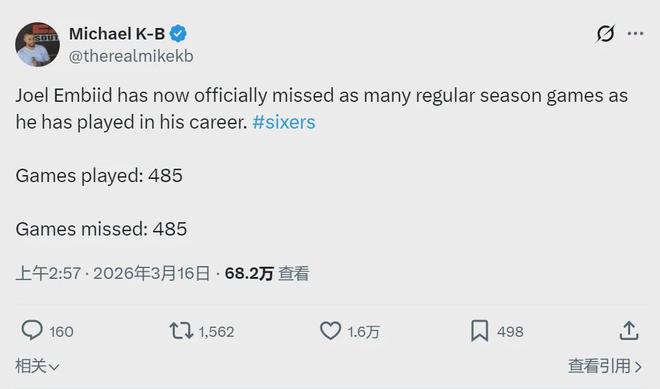 北京时间3月16日,NBA常规赛,76人109-103力克开拓者。恩比德因为右侧腹斜肌拉伤,连续第9场比赛缺席,目前仍是归期未定。本场是恩比德职业生涯缺席的第485场比赛,与生涯出战场次(485)持平,生涯出勤率恰好50%。