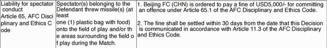 1.北京国安违反了亚足联纪律与道德守则第65.1条 被罚款5000美元。
