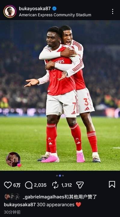 这是萨卡为阿森纳出战的第300场比赛。24岁的他,用一记制胜球为自己的里程碑之夜画上了圆满的句号。赛后萨卡接受采访时说:“这场胜利意义重大。比赛中我们听到球迷突然开始庆祝,我心里大概就知道,另一场比赛里出现了对我们有利的情况。但我们始终专注于做好自己。”
